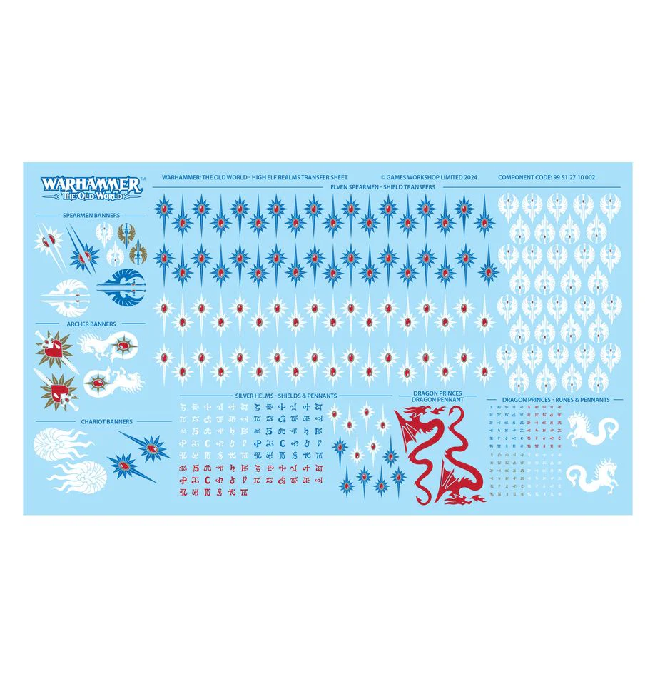 Silver Helms are young warriors recruited from families of noble blood, knights who exemplify grace, honour and all things good in Ulthuan, more than willing to charge headlong into battle against the odds. This box contains 12 Silver Helms with enough command options to make two units of six, plus a High Elf Realms Transfer Sheet featuring 356 transfers.